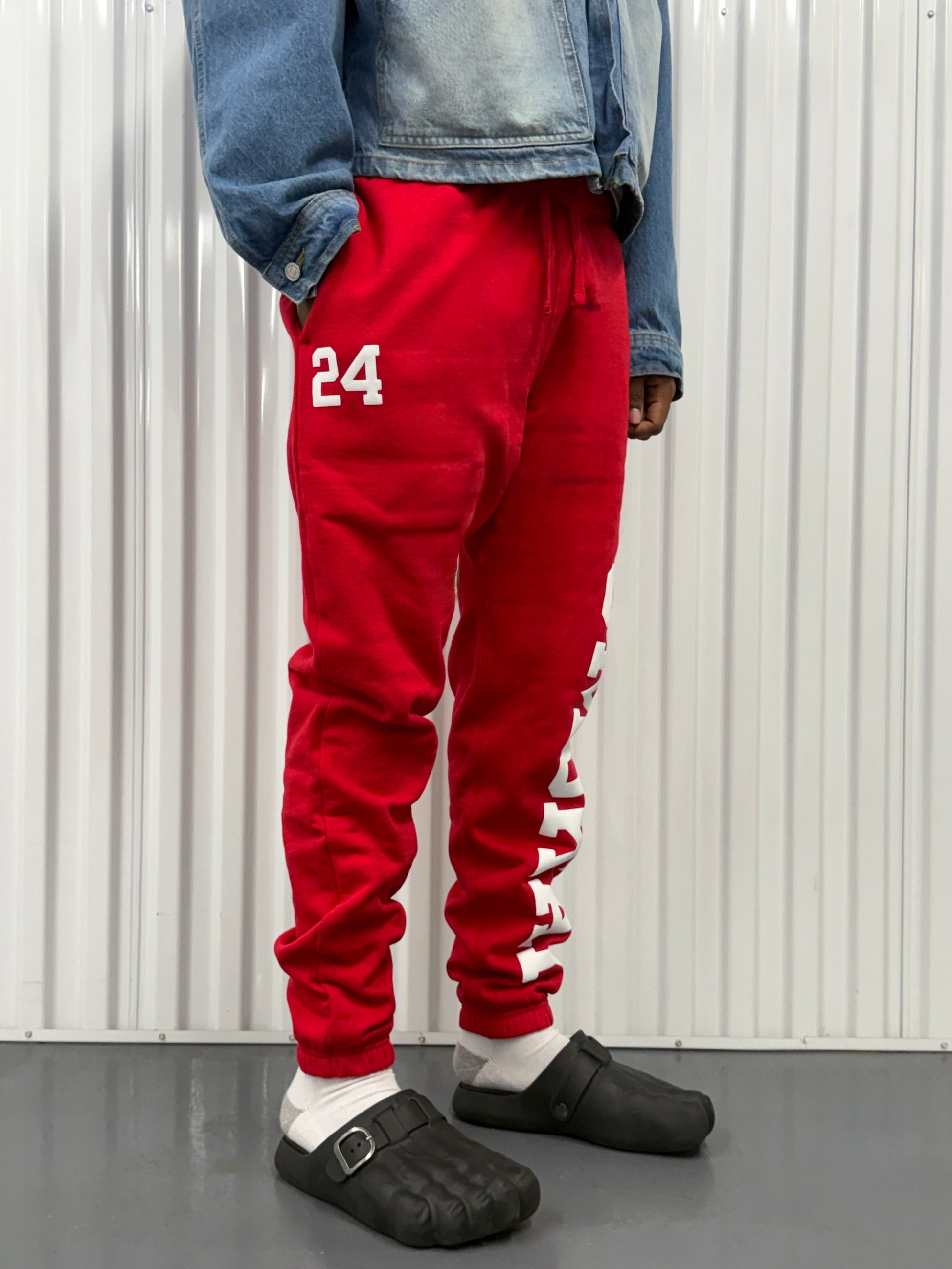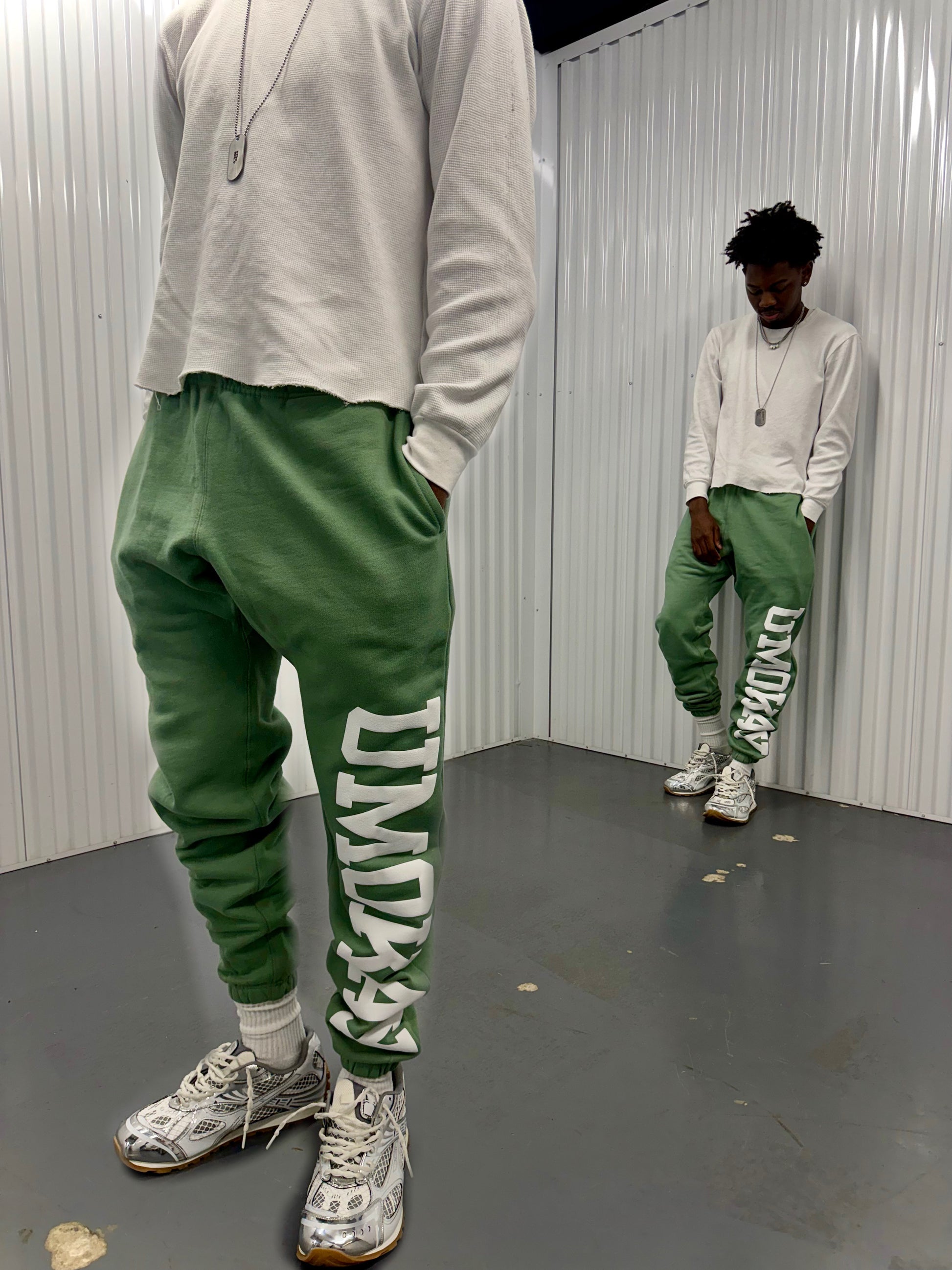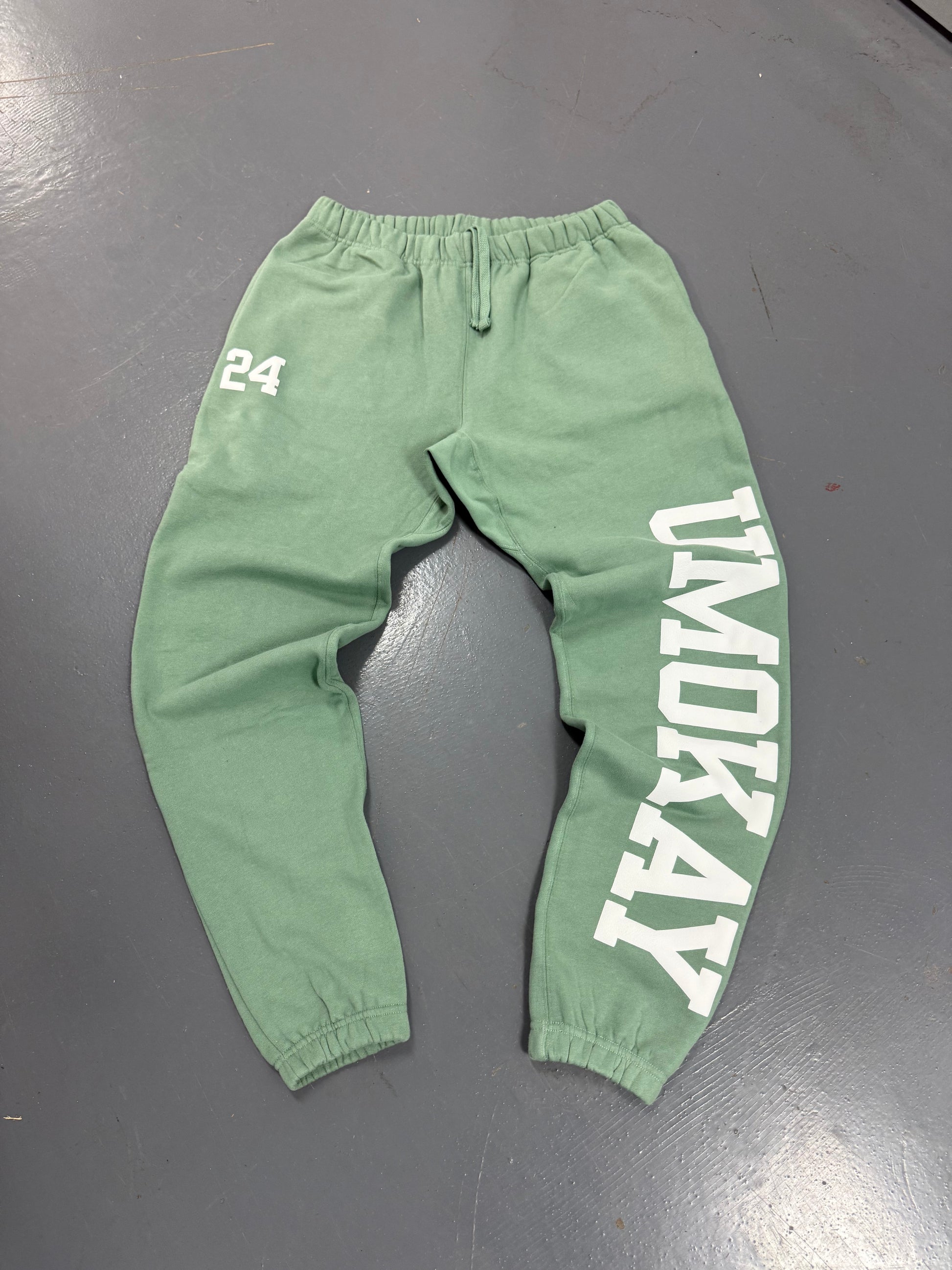 Puff print “UmOkay” down the leg